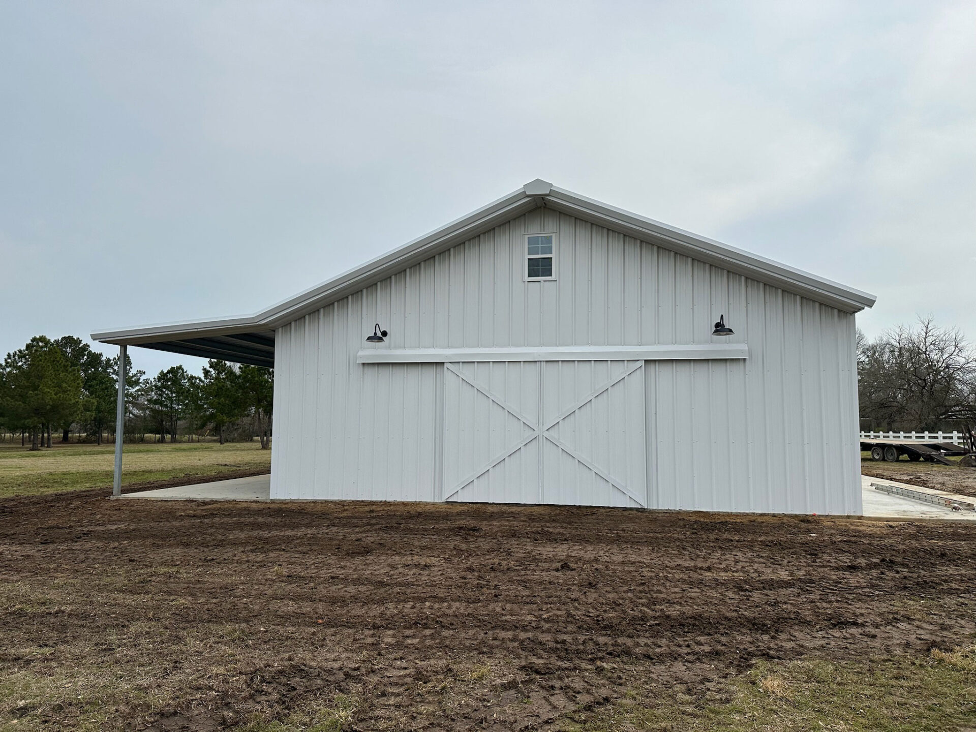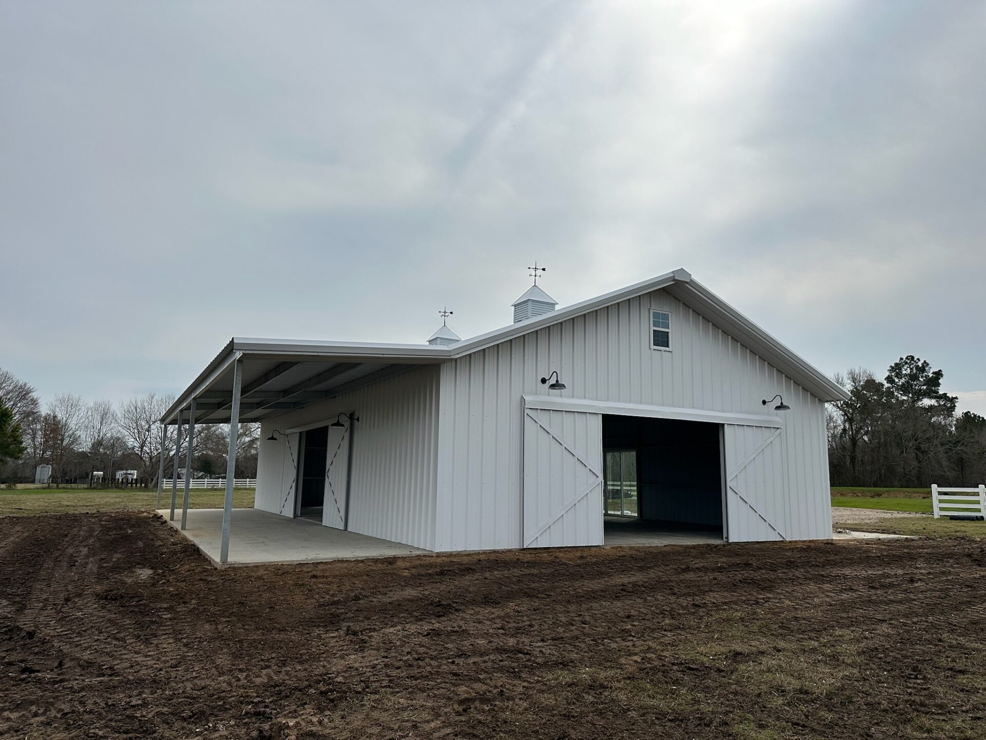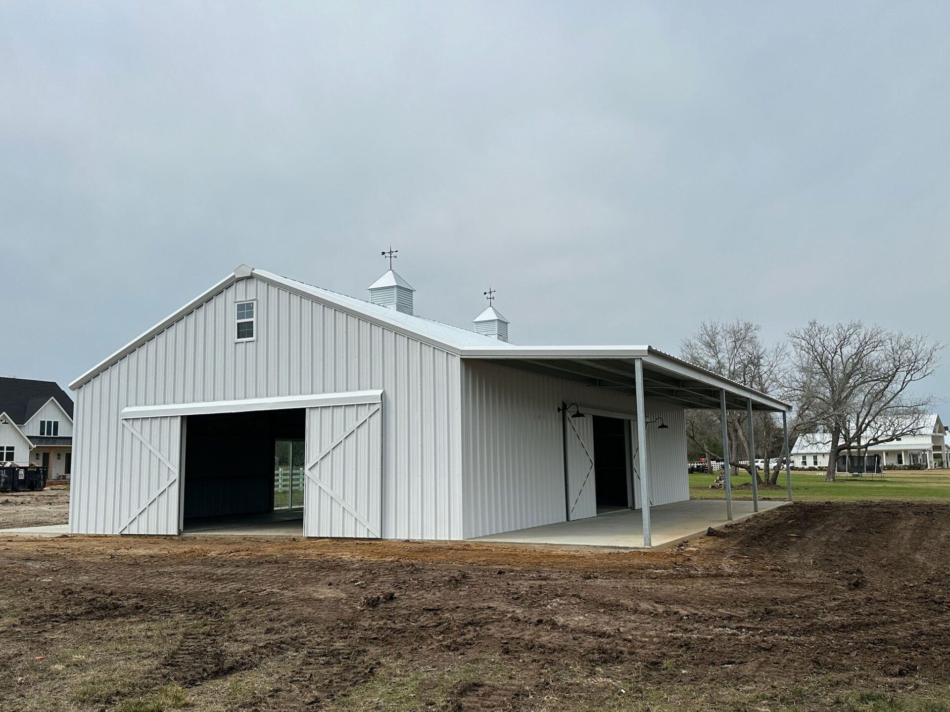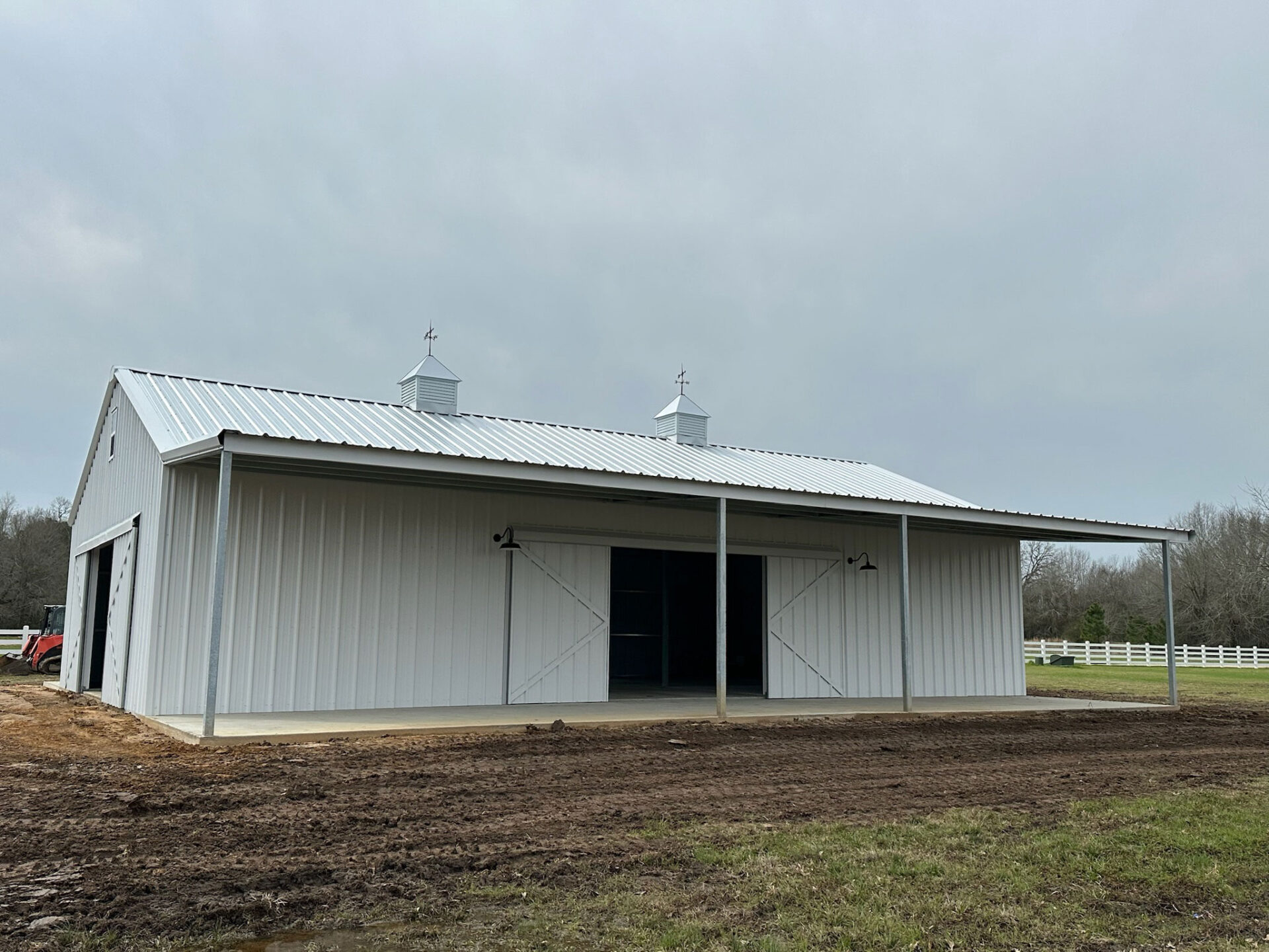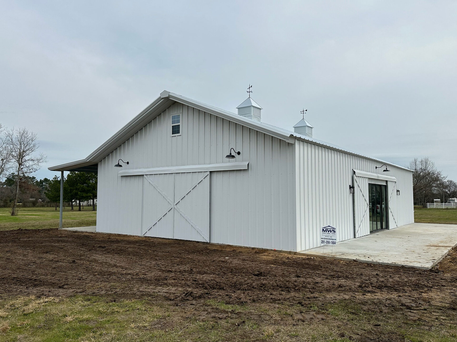 This custom 40’ x 60’ gable-style barn in Montgomery, Texas showcases the quality craftsmanship and turnkey building solutions MWS, Inc. provides. Designed with a full 12’ x 60’ lean-to, all-galvanized framework, and 26-gauge SMP Polar White panels, this structure delivers long-lasting durability with a clean, modern appearance. The barn features multiple crossbuck sliding doors, cupolas, and double-paned windows for both functionality and curb appeal. Our team handled everything from site work and concrete to rough-in plumbing and radiant barrier insulation, ensuring the customer received a fully prepped and construction-ready building pad.