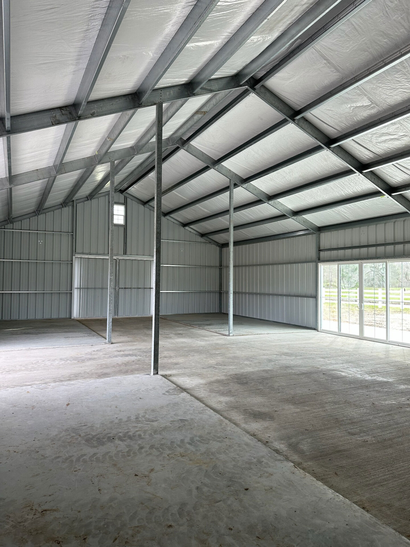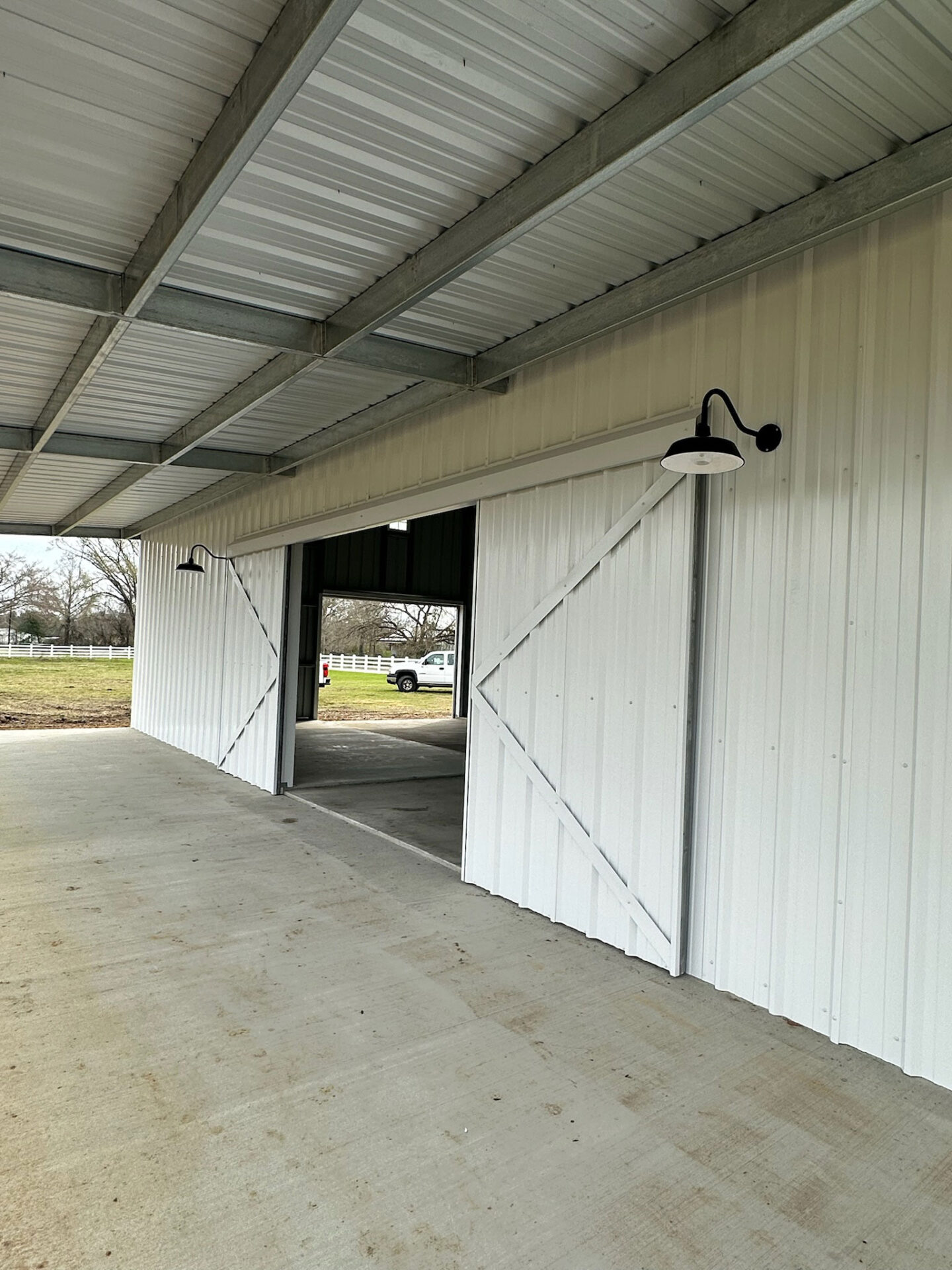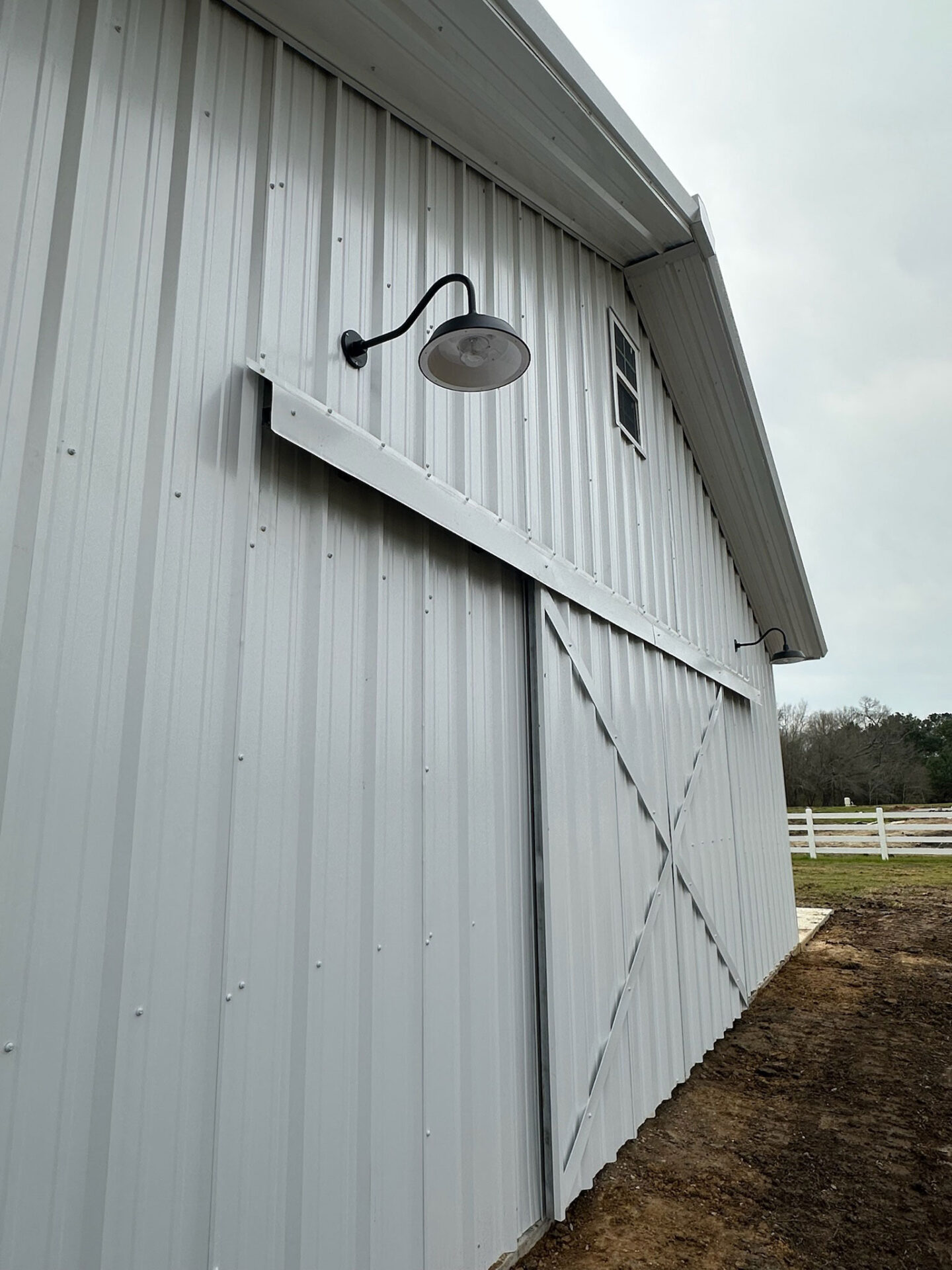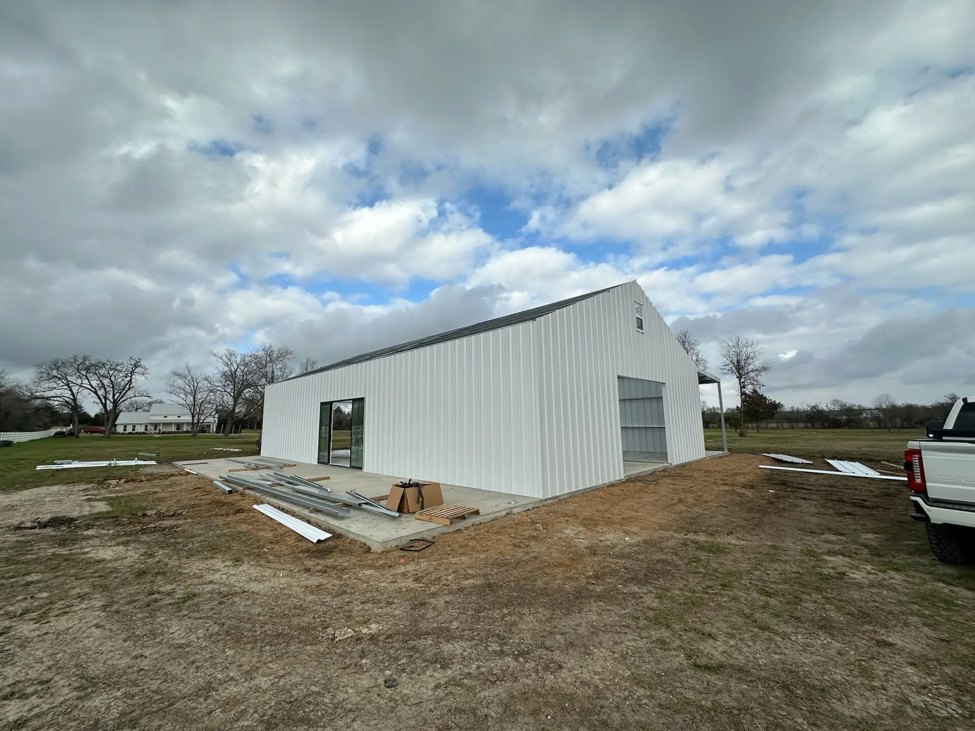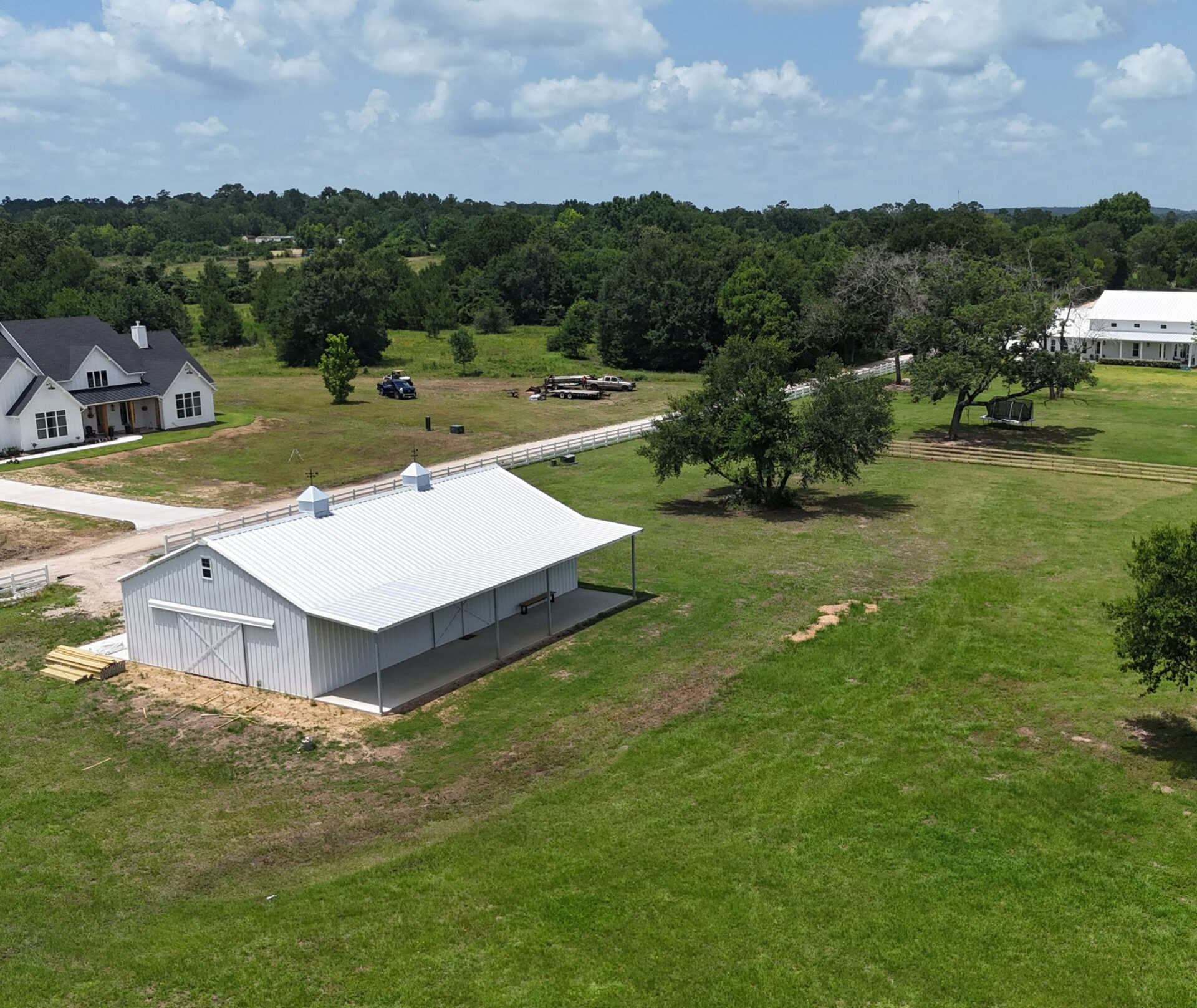 This custom 40’ x 60’ gable-style barn in Montgomery, Texas showcases the quality craftsmanship and turnkey building solutions MWS, Inc. provides. Designed with a full 12’ x 60’ lean-to, all-galvanized framework, and 26-gauge SMP Polar White panels, this structure delivers long-lasting durability with a clean, modern appearance. The barn features multiple crossbuck sliding doors, cupolas, and double-paned windows for both functionality and curb appeal. Our team handled everything from site work and concrete to rough-in plumbing and radiant barrier insulation, ensuring the customer received a fully prepped and construction-ready building pad.
